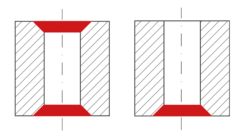 Beim Bohrungsaustritt wird das Messer über den gefederten Steuerbolzen wieder in Ausgangsstellung gebracht. Im Arbeitsvorschub rückwärts wird nun das Anfasen der hinteren Bohrungskante durchgeführt. Ist die Fase erstellt, fährt man das Faswerkzeug im Eilgang aus der Bohrung. Eine saubere Anfasung vor- und rückwärts in einem Arbeitsgang ist das Resultat.